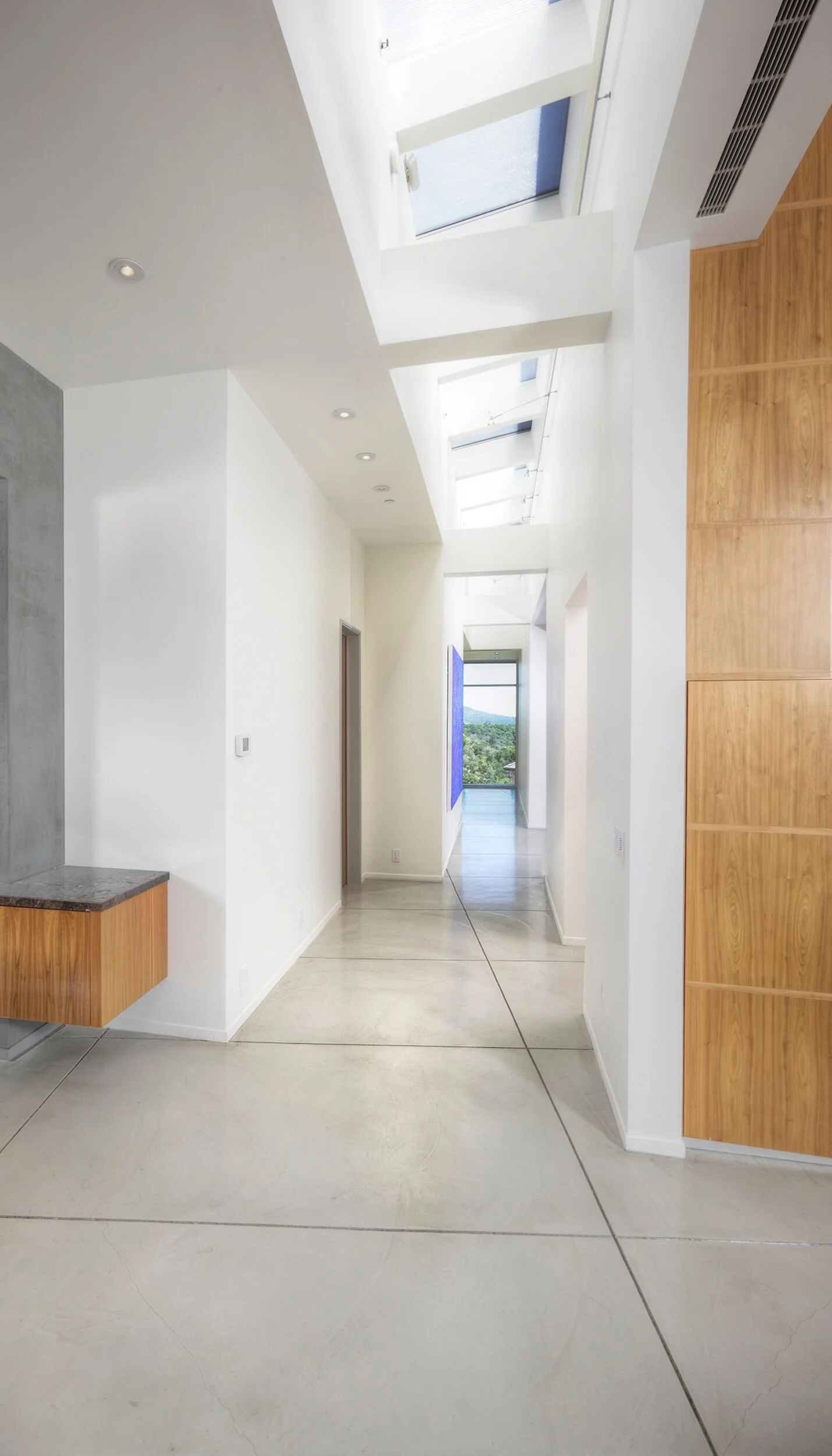 We love transforming circulation hallways into functional gallery spaces, enhancing them with abundant natural light from a skylight. A large window at the end extends the visual connection to the outdoors, creating a sense of openness and seamless integration with the surrounding environment.
