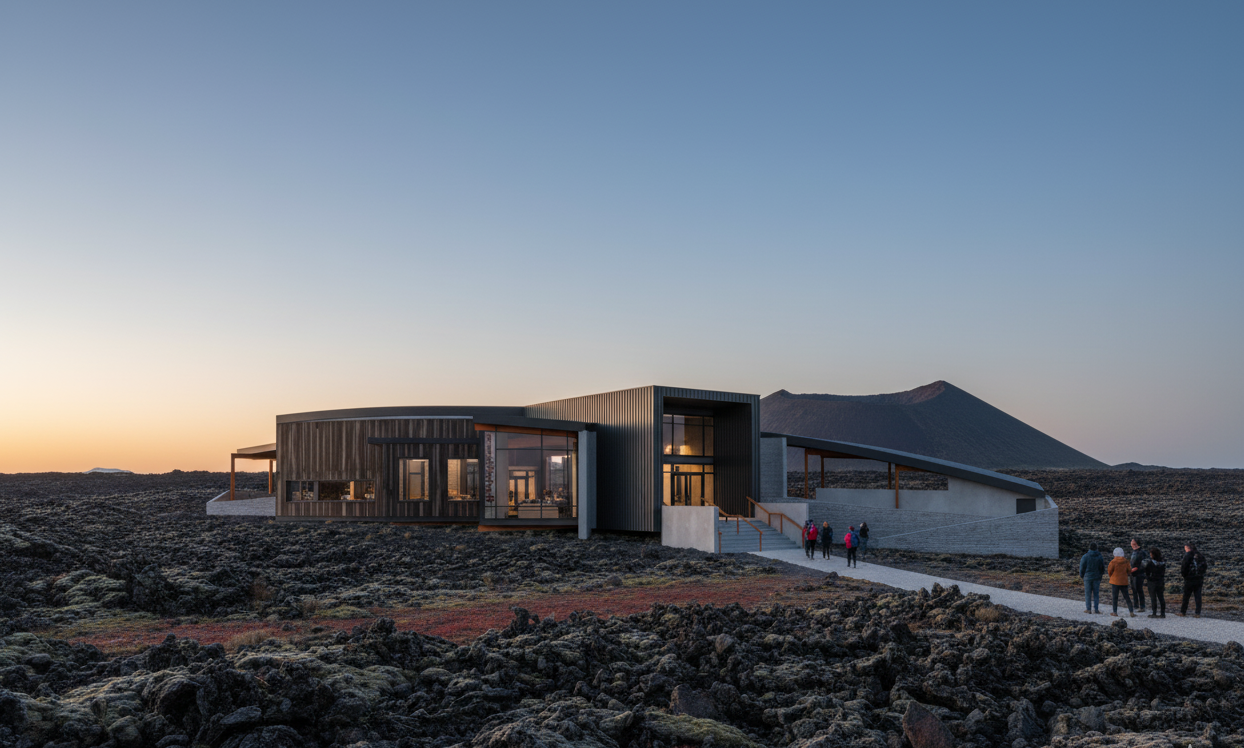 A sweeping curved roof unifies the composition while minimizing the impact on views. The building nestles into the dramatic topography, using rustic, durable materials that resonate with the volcanic terrain. Inside, sculptural benches double as seating and tables, and digital kiosks provide interactive, educational experiences.